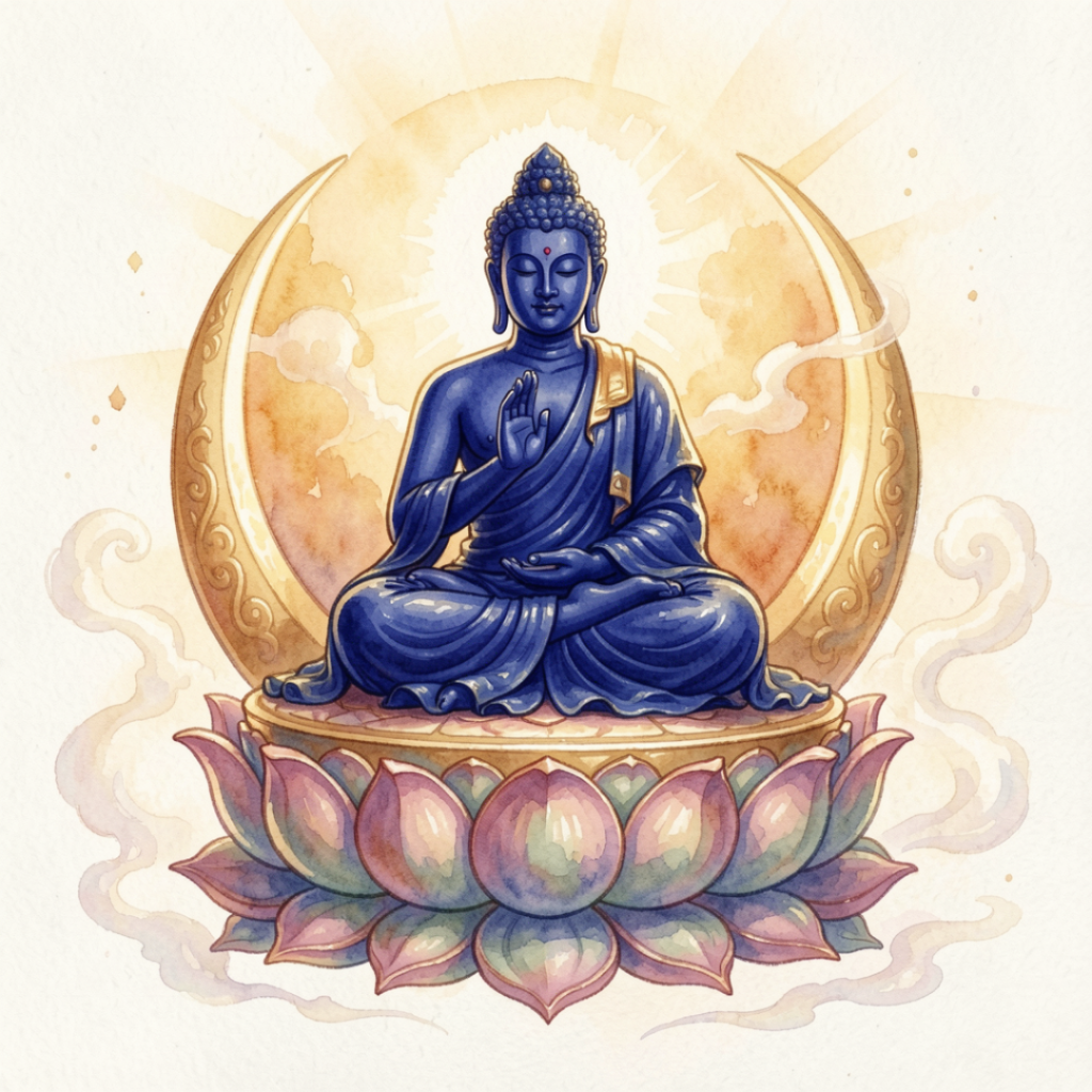 Der vollständige Name des Medizin-Buddhas lautet im Sanskrit Bhagavan Bhaishajya-Guru Vaidurya-Prabha-Raja. Jeder Teil dieses Namens trägt eine tiefe symbolische Bedeutung. Bhagavan bezeichnet den Weltverehrten, Bhaishajya-Guru den Meister der Medizin, Vaidurya verweist auf den Lapislazuli, und Prabha-Raja bedeutet der König des strahlenden Lichts. Zusammengenommen beschreibt dieser Name einen erleuchteten Lehrer, dessen Weisheit und Mitgefühl als heilendes Licht in alle Welten ausstrahlen.